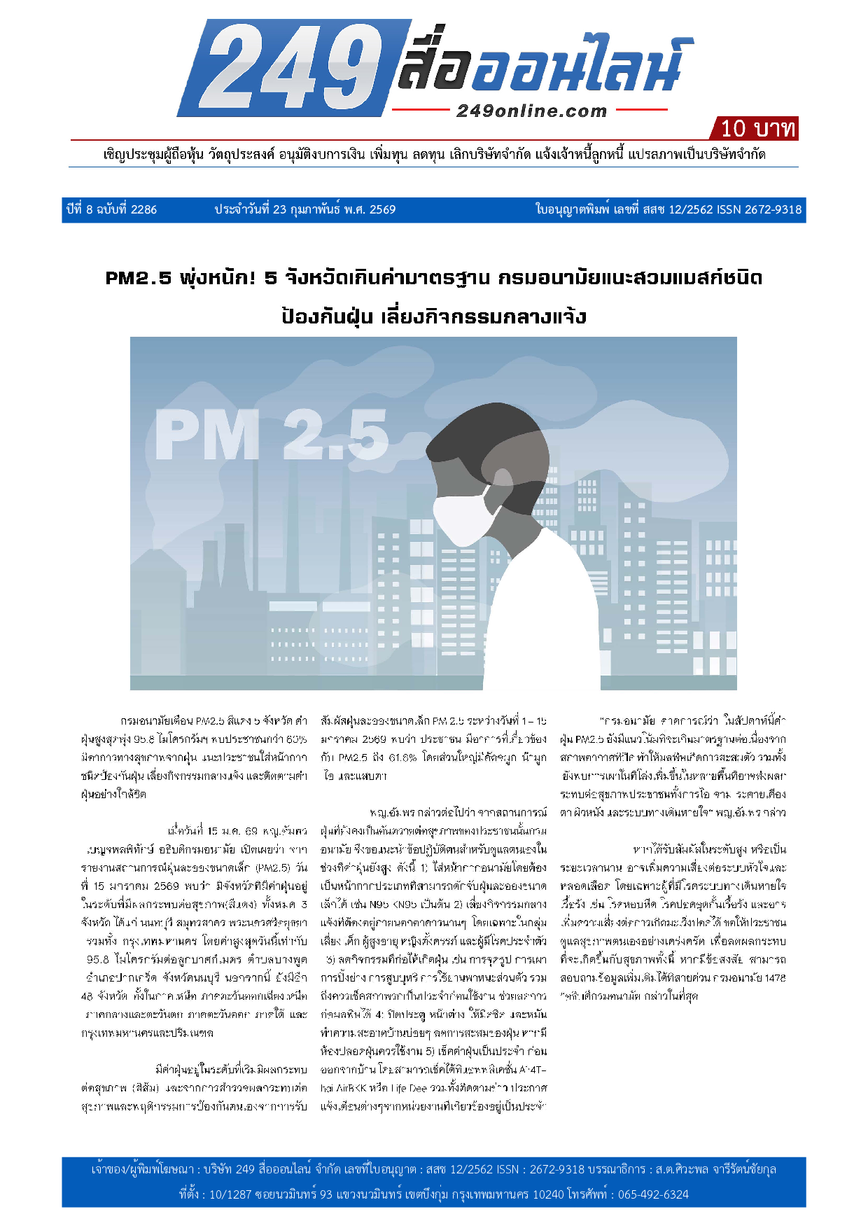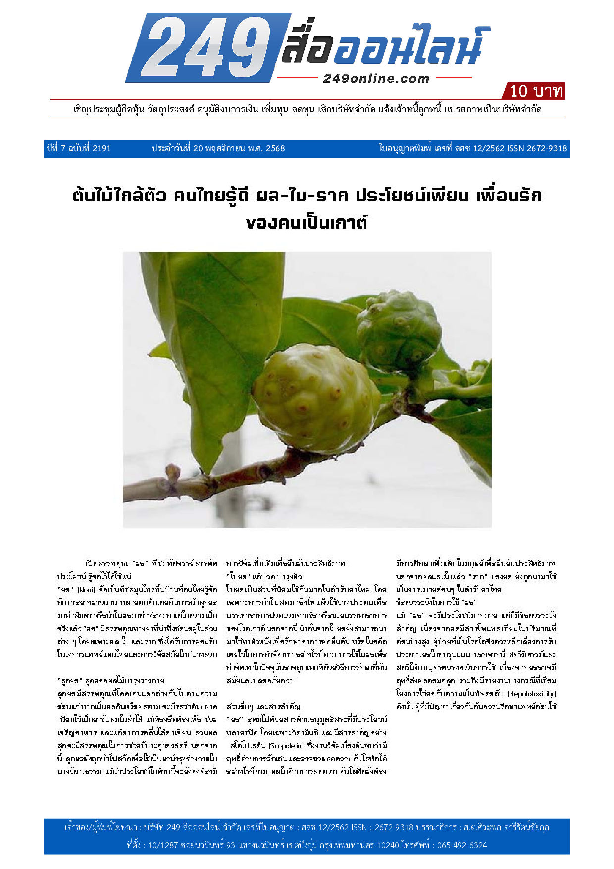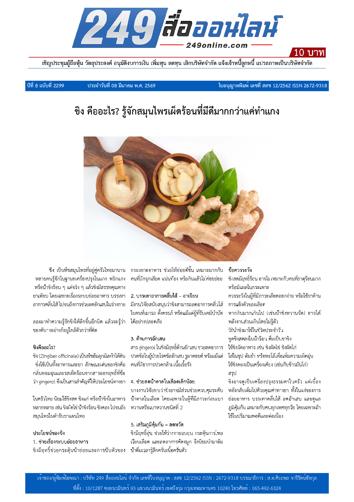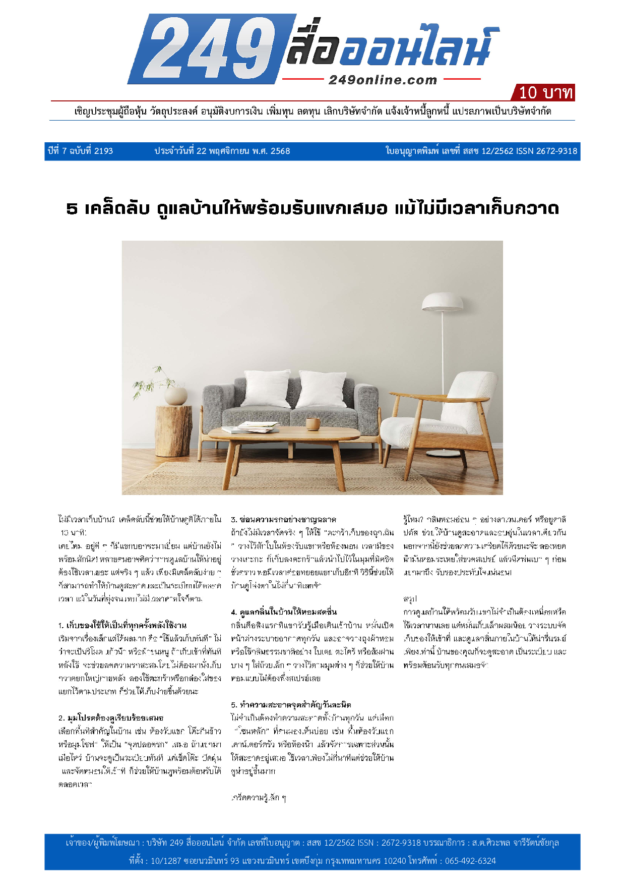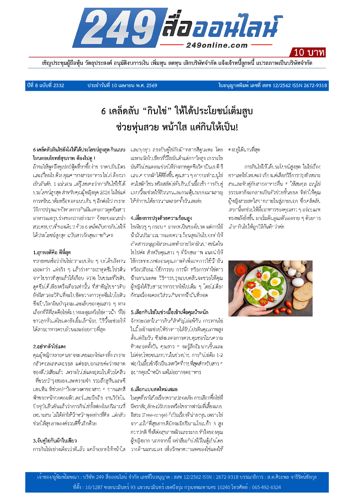 หนังสือพิมพ์ 249 สื่อออนไลน์ ได้จดแจ้งการพิมพ์อย่างถูกต้อง และได้รับใบอนุญาตเลขที่ สสช 12/2562 ISSN 2672-9318